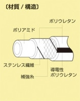 ●耐溶剤性:積層構造の内層にナイロン樹脂を用いているため、抜群の耐溶剤性(塗料、有機溶剤、シンナー等)を有します。(水性塗料は除く) ●耐屈曲性:アース線が金属繊維のため、銅線などの金属線と比較して、優れた耐屈曲性を示します